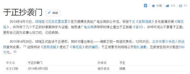 又比如说琼瑶告于正《宫锁连城》系列抄袭《梅花烙》,于2015年12月18日胜诉,连带着湖南卫视一同赔偿,从此于正再也不是芒果台的金牌编剧了,一路flop,可谓大快人心。