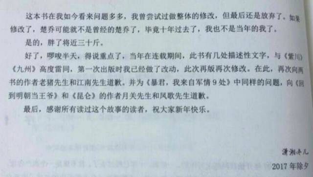 根据潇湘冬儿在2017年除夕时所写的后记内容来看,她并没有忘记自己抄袭的这件事,可遗憾的是,再版内容的抄袭部分几乎没有删减。