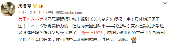 讽刺的是,周浩晖居然败诉了,因为《美人制造》有三十集,在最后两集才有部分内容涉嫌抄袭,按超过20%才算抄袭的比例算,周浩晖想打赢这场官司,希望其实是很渺茫的。