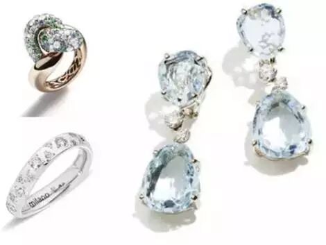 玫瑰金镶冰钻、蓝宝石和沙弗莱石戒指+白金镶钻石戒指+白金镶海蓝宝和钻石耳坠