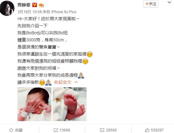 3月18号,贾静雯微博传来喜讯,3000克第三胎爱女Bobo终于出生啦。