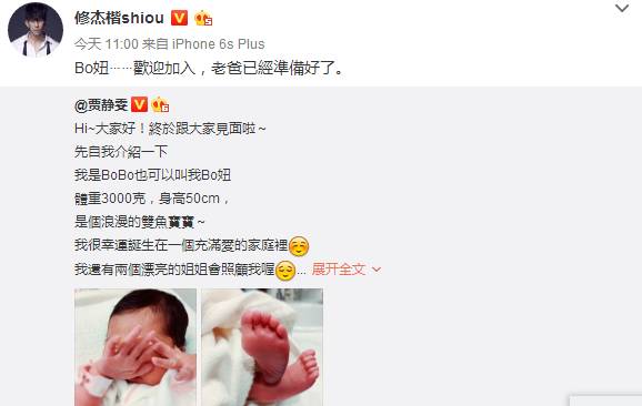 贾静雯的老公修杰楷随后也转发微博,表示“Bo妞欢迎加入,老爸已经准备好了。”
