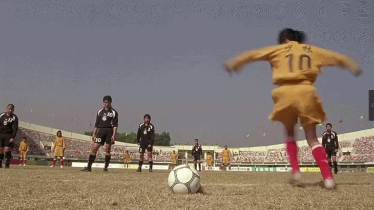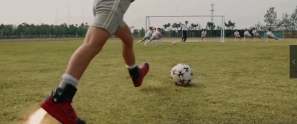 上体育课时,七仔又造出超级球鞋,让小狄成为跳高、游泳、跑步全能超人,其中踢足球的桥段,从画面到音乐,都致敬了周星驰自己2001年的经典《少林足球》。