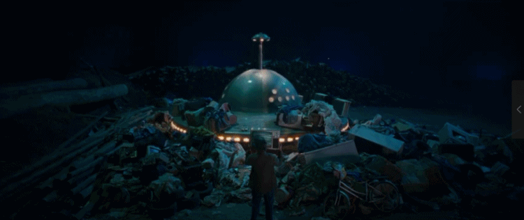 周铁正在垃圾场翻找可以捡回家的东西,一架飞船缓缓升起,这个场景,致敬了斯皮尔伯格执导的科幻电影《第三类接触》。