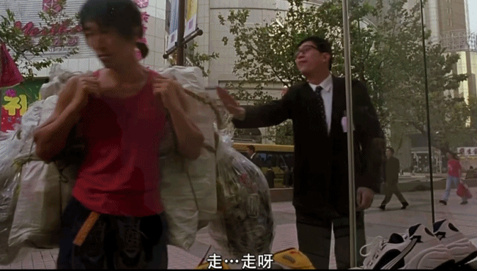 这个镜头,跟《少林足球》开头,五师兄看了一眼橱窗里的球鞋,就被店员驱赶,店员还郑重其事地擦拭玻璃的行为一模一样,把富人对穷人的歧视非常夸张地呈现了出来。