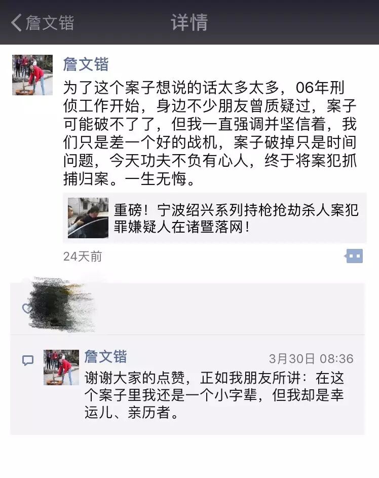 直到3月29日下午徐某被抓,这口堵着的气才顺了下去,他在自己朋友圈说,“为了这个案子想说的话太多太多,06年刑侦工作开始,身边不少朋友曾质疑过,案子可能破不了了,但我一直强调并坚信着,我们只是差一个好的战机……”,回复朋友祝福时,他说,“在这个案子里,我还是小字辈,但我却是幸运儿、亲历者”。