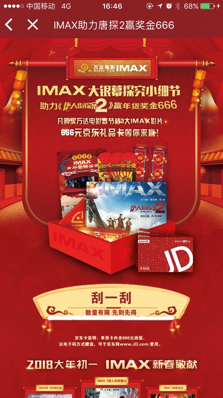 1、春节期间,登陆万达电影APP,即可参与刮奖,666元礼品卡等你来拿。购买IMAX电影票,可获得另外刮奖机会,千万不要错过!