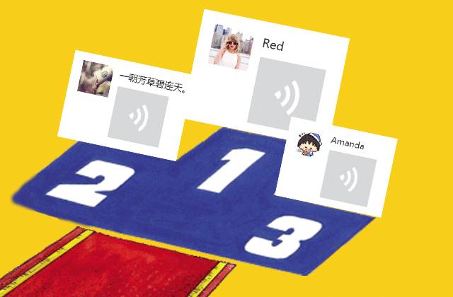 经过一番激烈的争夺,由网友票选出的上周语音演唱的前三名分别为: