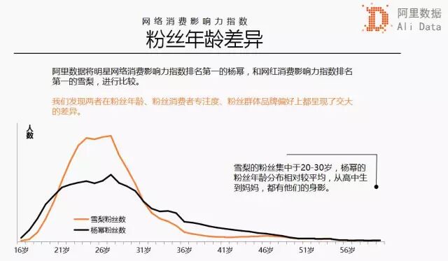 在通过比较粉丝年龄差异后发现,网红雪梨粉丝年龄段更聚焦在20-30岁人群,而杨幂的粉丝年龄分布则更为发散。也就是说,作为影视红人的杨幂在人气覆盖上具有更广泛的大众基础。