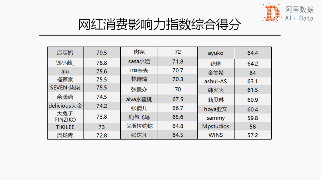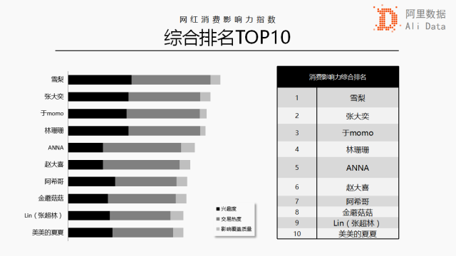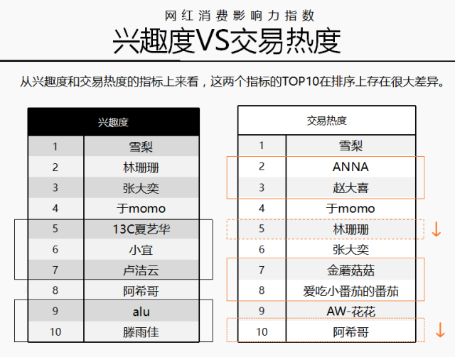 从阿里的数据可以看出,网红的人气和吸金能力并不能划上等号。兴趣度指标Top10与交易热度指标Top10的差异几乎过半。