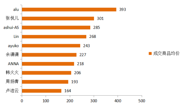紧随alu,排在第二位的张悦儿,其相关店铺商品成交均价也达到了300元。alu、张悦儿所影响的商品集中在女装领域,300、400元的成交均价在夏季女装商品中处于中高端水平。