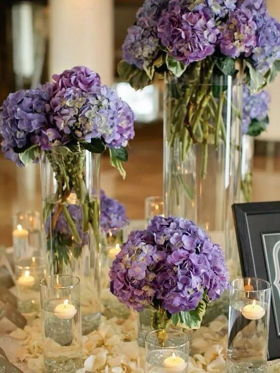 紫色绣球也是不错的选择。一簇繁茂的紫色绣球,在无数个紫色渐变小花序里仿佛藏着无数个折叠的宇宙。一朵或几朵插在一起,十分吸引眼球。但绣球的花期,还要再等等哦。