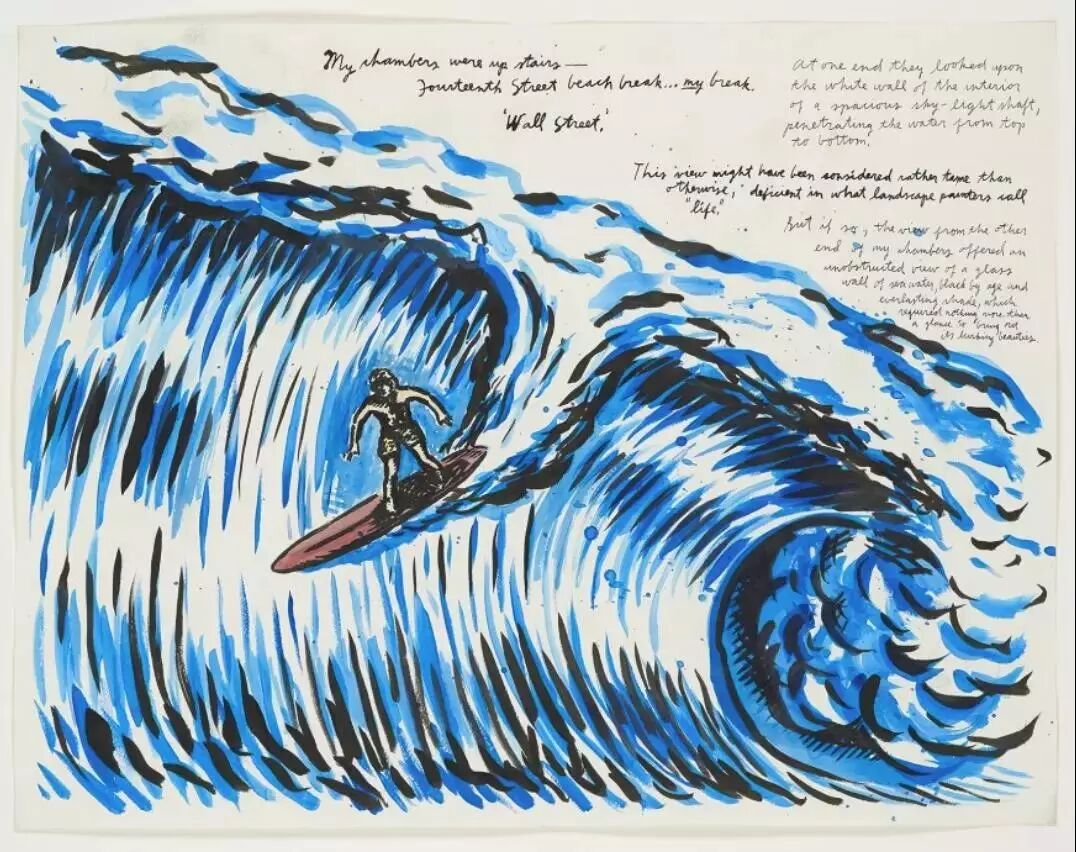 眼前这张画,虽轻,虽贴在白墙上,仿佛也有了浪的重量,向人压过来,透不过气时,你开始发现画里还有个微小的冲浪者。