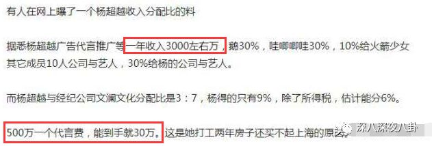 而这3000万也只有很少到了艺人的口袋,随便举个例,500w的游戏代言费,杨超越拿到手也就30w
