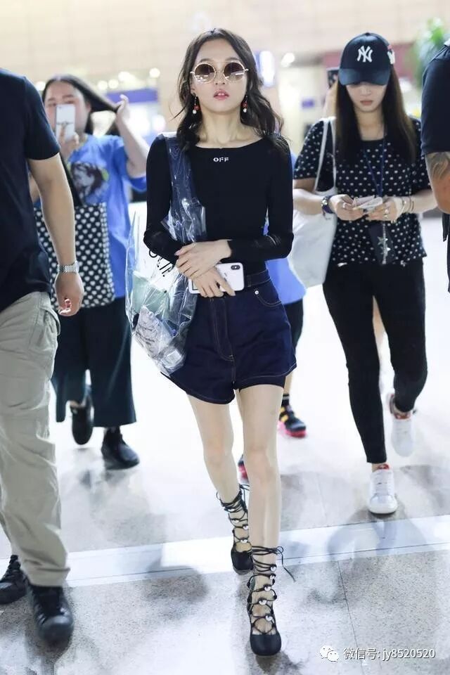 张韶涵上身穿着一件黑色的V领T恤,展示了她纤瘦的身材,她还在腰间将衣角系上一个结,露出一点点小蛮腰,这是秒变“小腰精”的节奏啊。