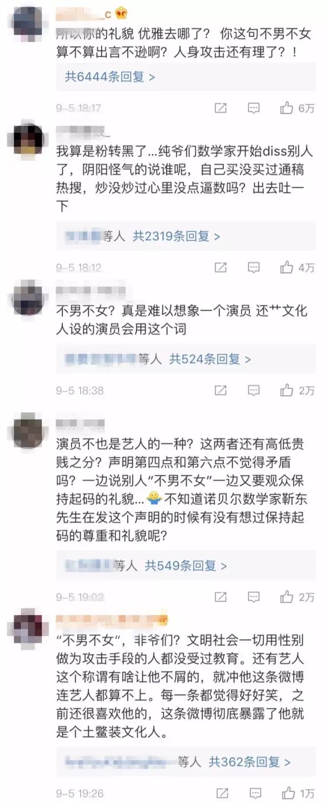 先不说靳东哪里来的优越感认为演员比艺人高贵,也不说他和正午阳光到底存不存在经纪合约。光是攻击别人“不男不女”就让大家很费解了。