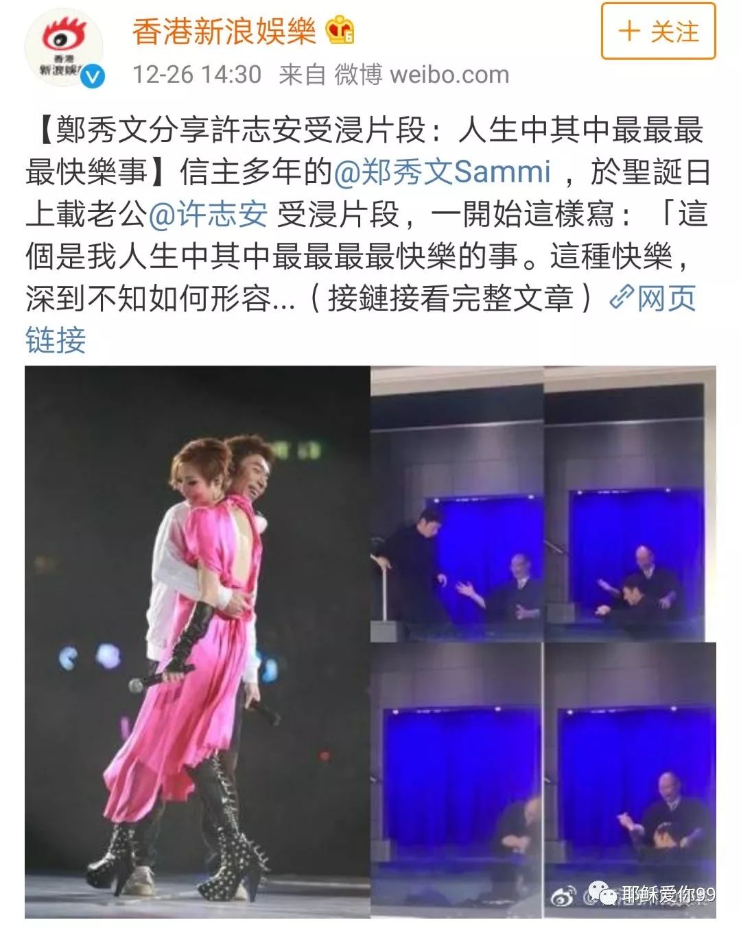 Sammi(郑秀文)在社交平台留言:这个是我人生中其中最最最最快乐的事,这种快乐深到不知如何形容。分享这条片并不是要秀什么恩爱,而是带着最大的喜悦分享这个时刻。(拍片时因为在哭,手都发抖,所以视频拍得好差 )mi(郑秀文)十年前在这个教堂这个小水池受浸,十年后的12月17日安仔都在同一个小水池受到浸成为神的儿子,mi确实好感动,亦都好快乐,这种快乐是来自心灵上精神上和灵魂上的, 没有其他快乐可以比拟。(不知为何打到这里,自己的眼涙忽然不断流在脸上......是喜悦和感恩的眼涙)