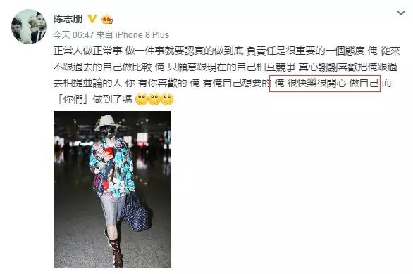 而陈志朋呢,面对这次时装周的群嘲,他发表微博说:俺 很快乐很开心 做自己。