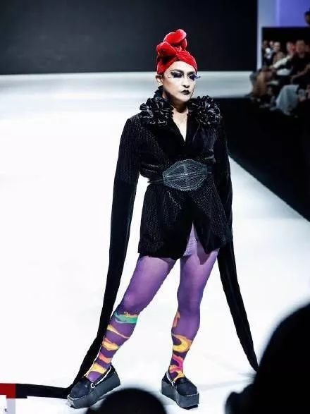 “千面男爵”贴着夸张假睫毛浓妆艳抹,脚踩Lady Gaga同款“驴蹄靴”,紫色丝袜抢眼!头绑红丝巾,身穿“浴袍”,两条袖子长到地面......