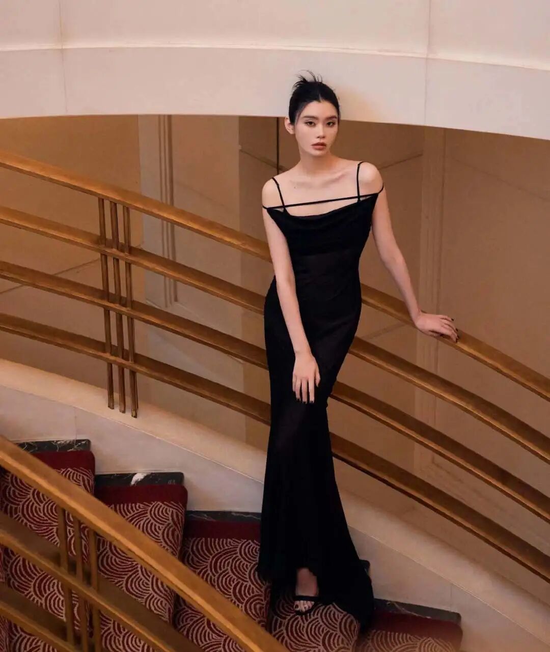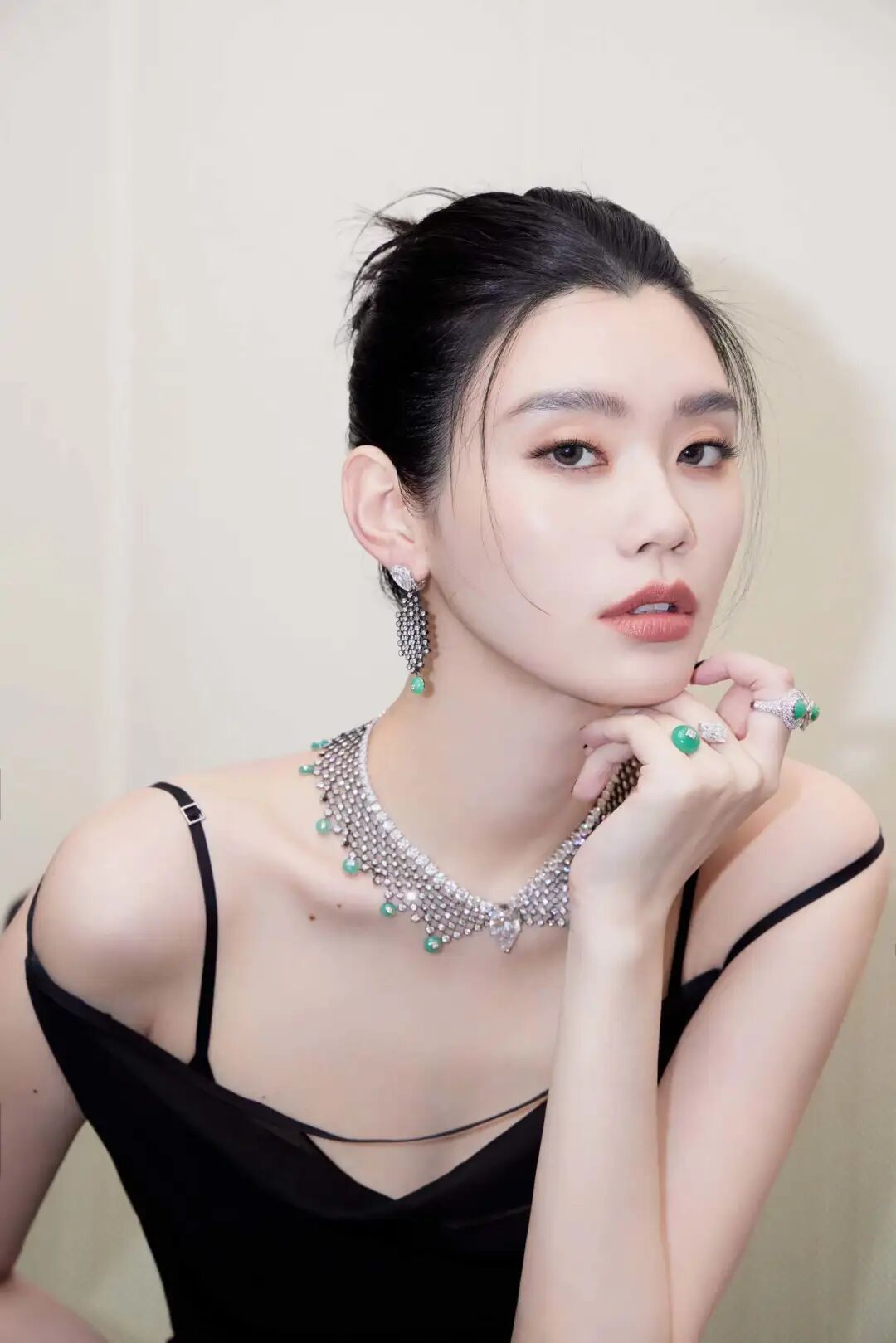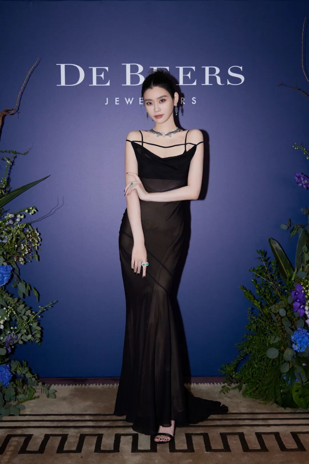 参加戴比尔斯珠宝活动,一条简约细肩带黑裙: