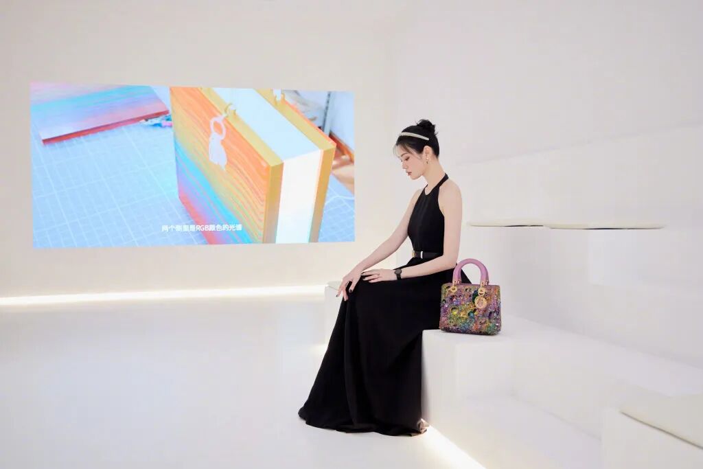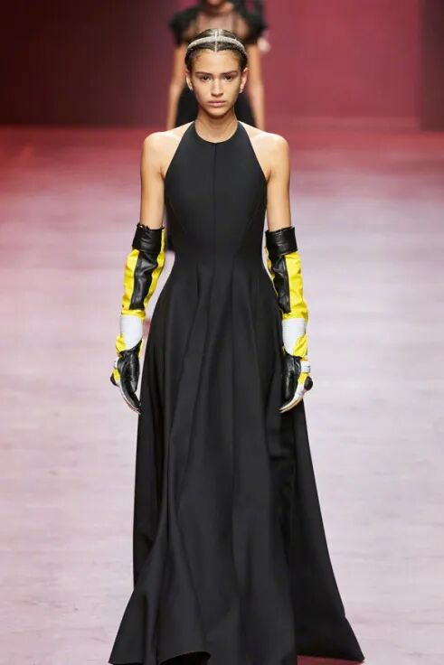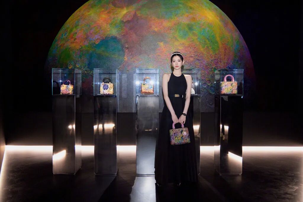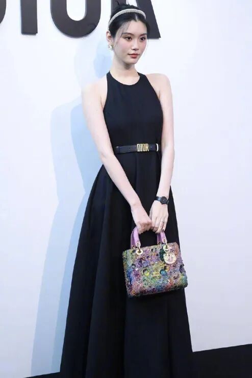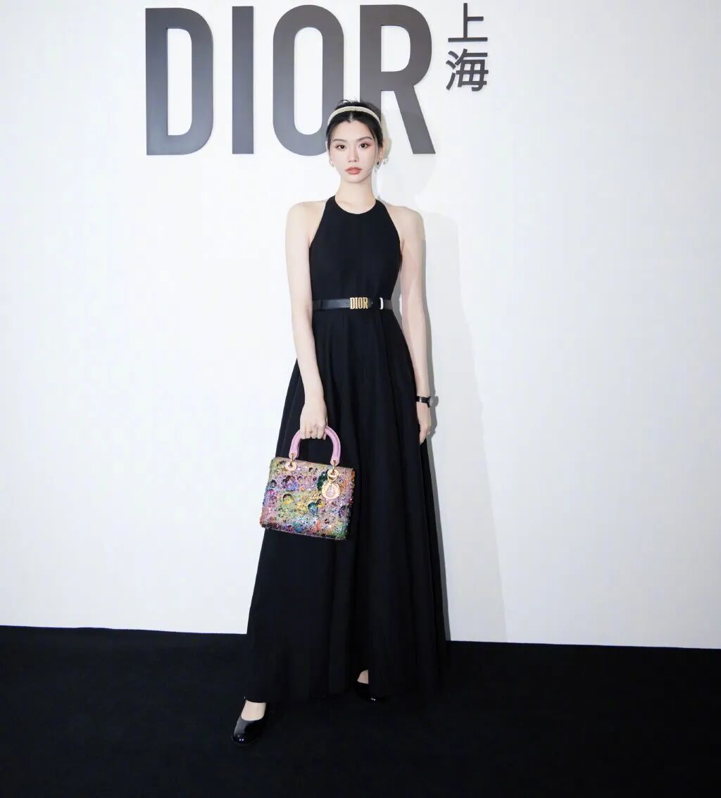 尤其与艺术品一起合照,类似最近的迪奥展览开幕式,一身Dior2022秋冬挖肩连身长裙:
