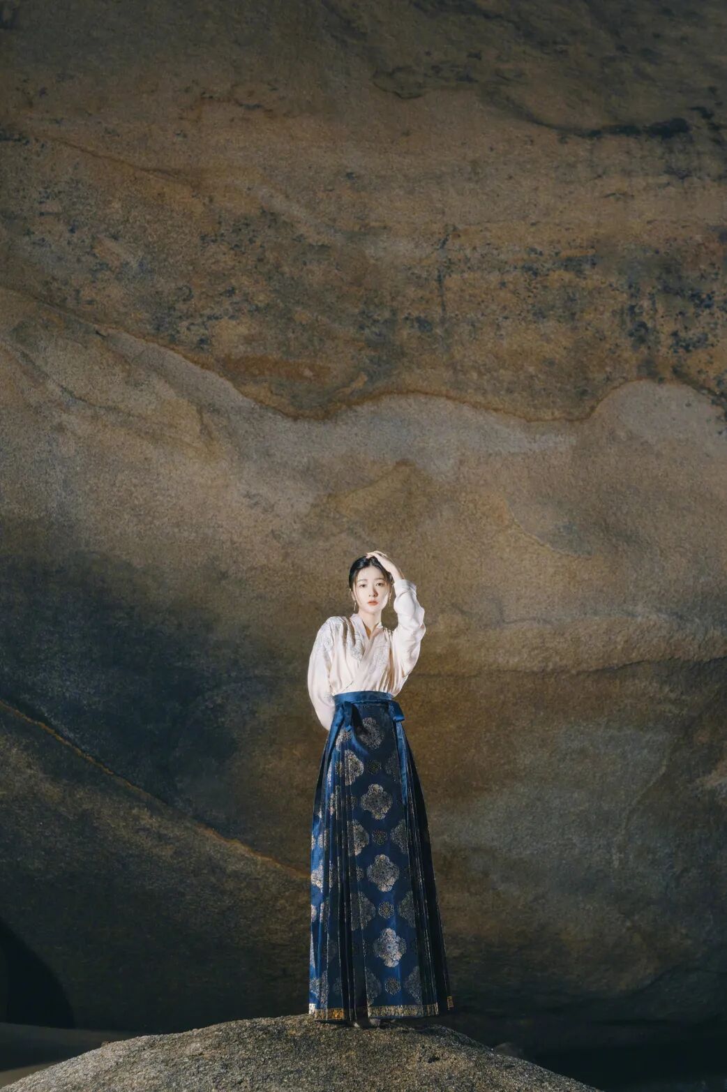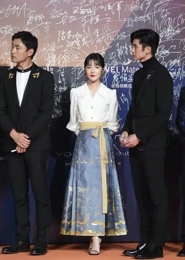 深蓝色织金的马面裙大气端庄,在红毯现场也很能撑得住场子。