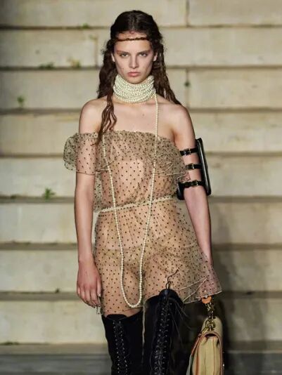 她身上的波点连衣裙来自Gucci,照搬了模特的搭配,戴了繁复的珍珠项链。