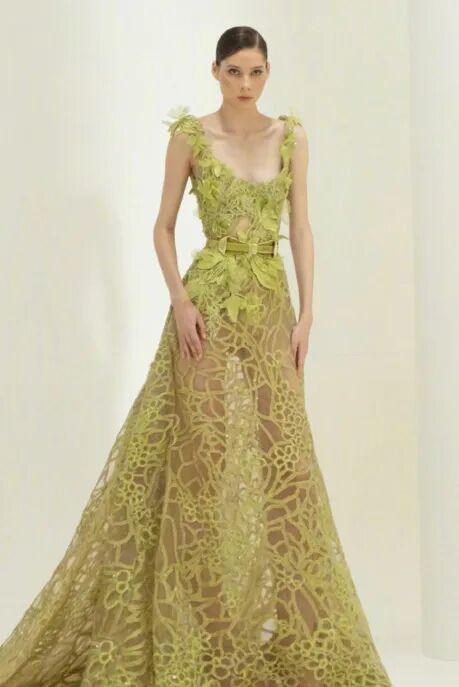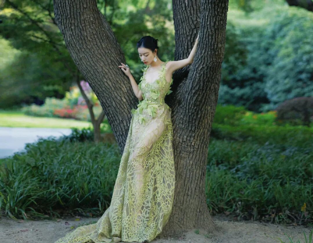 一套是Elie Saab2021秋季高定仙女裙,浅绿色花叶装饰蕾丝的衣服,不是肤白貌美的姑娘都不敢轻易尝试~