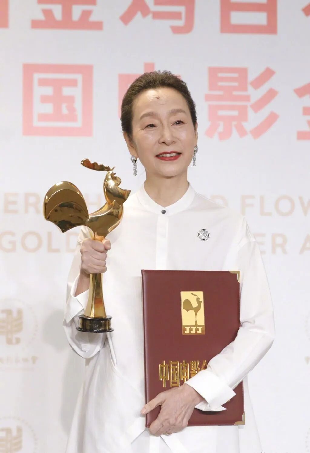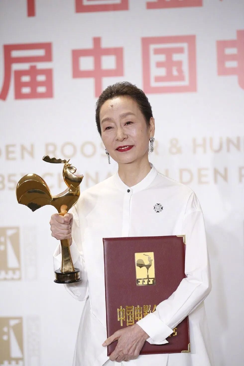 当天穿了两件干干净净的白衣服,和倪妮一起走红毯是蕾丝衬衫配蕾丝半裙,领奖穿了宽松简洁的立领白衬衫,气质很好。
