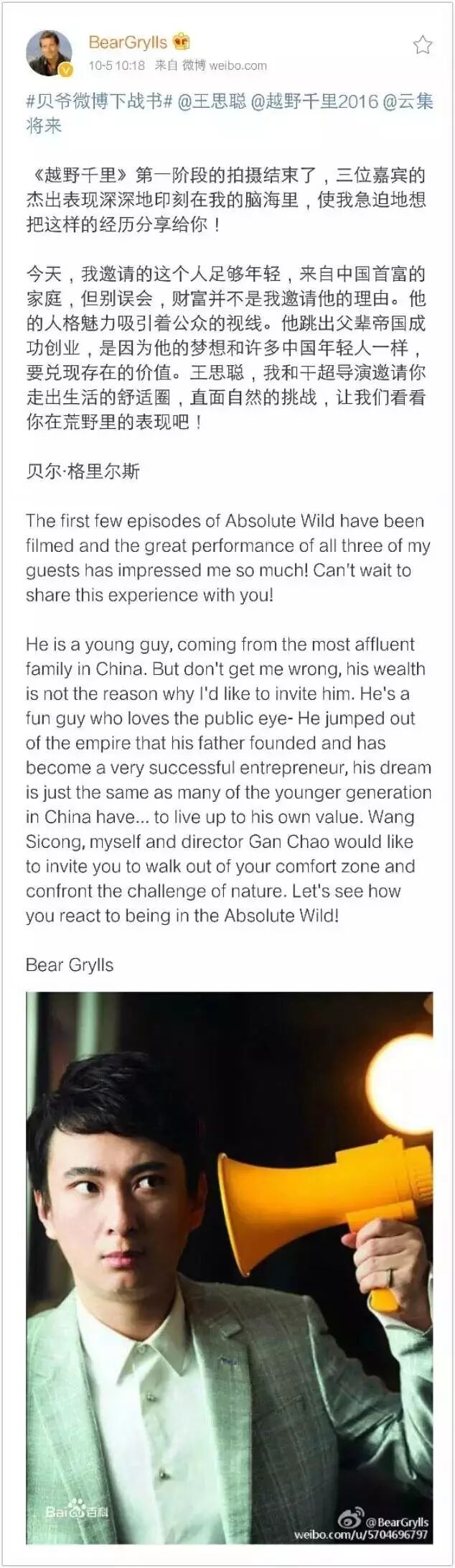 这次,他用十足的勇气和自信接受了贝爷的荒野挑战——“这样的挑战太刺激!我会全力以赴”。