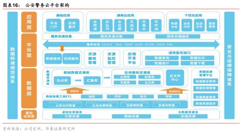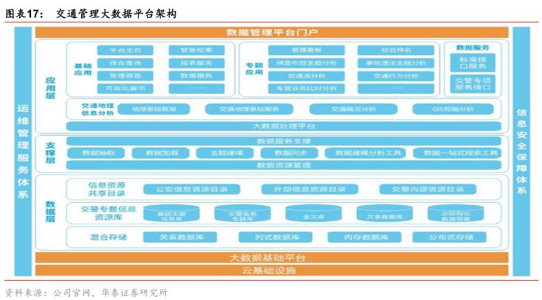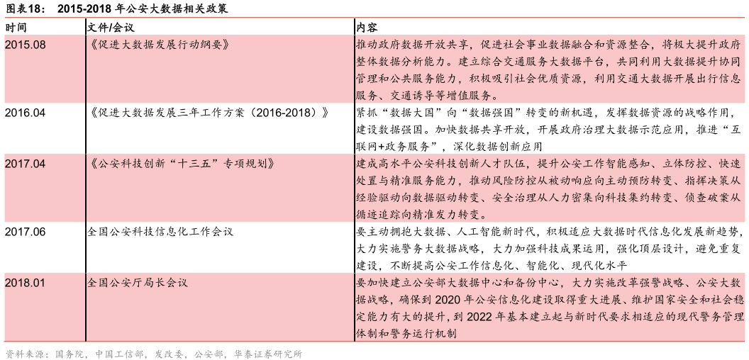 国家政策推动公安大数据平台发展。为了实现“数据强国”目标,提高政府的治理效率,政府出台了一系列政策鼓励“互联网+政务服务”发展,大力实施警务大数据战略,充分发挥科技信息化对公安工作体制、机制、管理创新的推动作用。2018年1月,全国公安厅局长会议指出,今后五年,公安部门要大力实施改革强警战略、公安大数据战略,确保到2020年公安信息化建设取得重大进展、维护国家安全和社会稳定能力有大的提升,到2022年基本建立起与新时代要求相适应的现代警务管理体制和警务运行机制。我们认为,公安大数据相关政策持续加码,公安、交警行业云平台将迎来快速发展期。