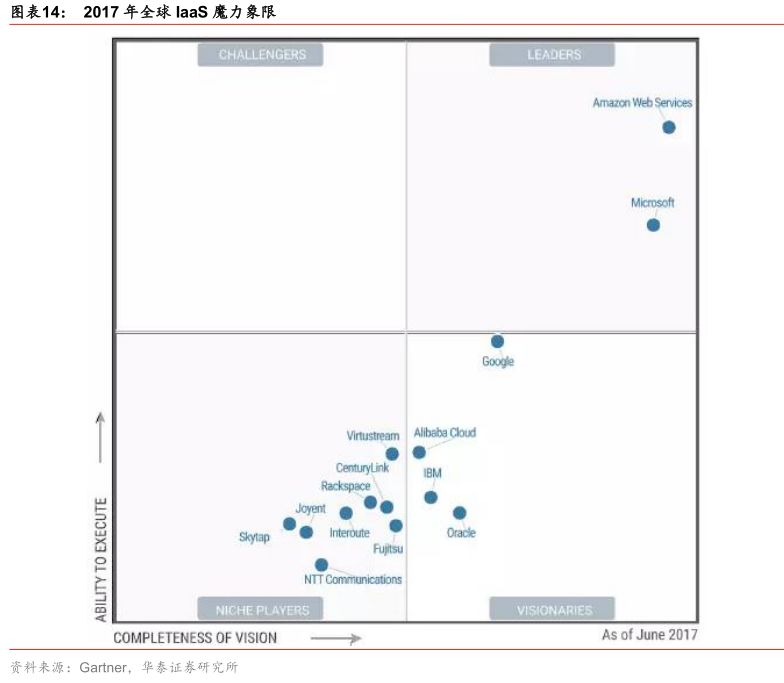 互联网巨头及ICT服务商聚焦IaaS&PaaS层。随着云计算的兴起,IaaS和PaaS行业获得了快速的发展,吸引着互联网巨头和ICT服务商纷纷加入行业。根据Gartner发布的2017年全球IaaS魔力象限,AWS和微软共同称霸全球IaaS市场,是全球IaaS市场的领导者。阿里云作为中国IaaS市场份额领先者首次进入Gartner的IaaS魔力象限,处于魔力象限的远见者区域,处于远见者区域的公司还包括谷歌、IBM和Oracle。而在中国PaaS公有云市场上,阿里云同样保持领先地位。