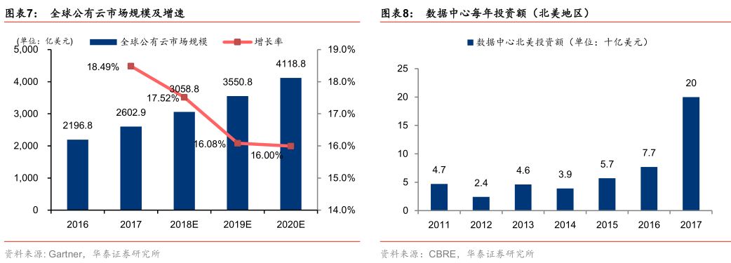 从供给端来看,云基础设施的不断完善推动着SaaS服务的快速发展。全球公有云市场正在蓬勃兴起,根据Gartner研究,2017年云计算市场规模增速超过15%,预计到2020年,全球公有云市场规模将达到4118.8亿美元。面对充满潜力的公有云市场,各大公有云巨头纷纷在全球建立数据中心抢占市场份额。根据CBRE的研究,光在北美地区,2017年在数据中心上的投资便达到了200亿美元,远超2016年的77亿美元。数据中心数量的不断增长完善了云基础设施,在此基础上,云计算不断发展,逐步迈向成熟。作为云计算的一部分,SaaS服务也受益于这波数据中心兴起的浪潮。