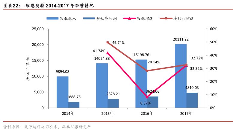 维恩贝特致力于开发增量市场。在《发行股份及支付现金购买资产暨关联交易报告书(修订稿)》文件中,维恩贝特做出业绩承诺,2016年度、2017年度、2018年度的承诺净利润分别不低于3,800万元、4,750万元和5,940万元。到2018年12月31日,维恩贝特需按照其承诺完成三年业绩总额人民币14,490万元,否则需要按未完成三年承诺业绩总额的比例进行补偿。目前维恩贝特2016年度和2017年度经过调整的净利润分别为3,357.93万元和4,778.92万元。2017年,维恩贝特90%收入都来自于存量市场,存量市场收入稳定,目前维恩贝特正在致力于开发增量市场,开拓新客户市场。