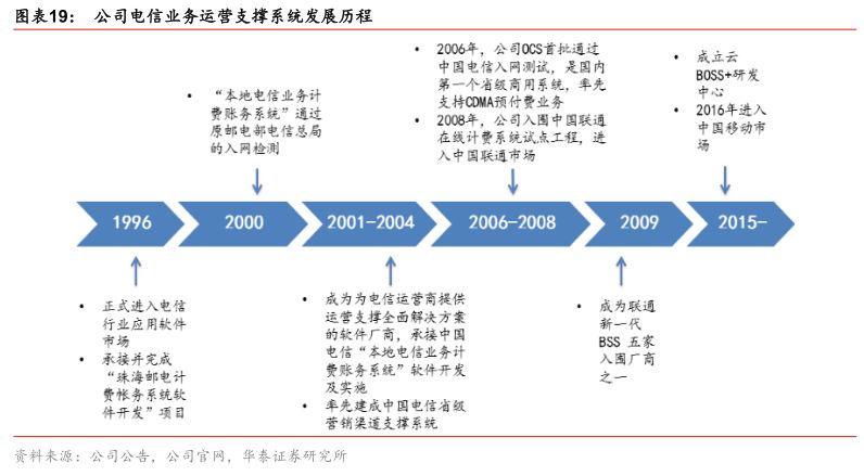 公司电信业务发展历史悠久,未来推进电信业务与云计算结合。目前国内主要电信运营商应用软件系统逐步形成电信业务支撑系统(BSS)、运营支撑系统(OSS)、管理支撑系统(MSS)三大领域。公司从1996年起正式进入电信行业应用软件市场,是国内最早进入电信支撑系统的企业之一,2000年初就与中国电信建立了合作,BOSS(融合了BSS与OSS的综合性业务运营和管理平台)系统及相关软件产品业务一直是公司的主营业务之一,主要客户是中国电信和中国联通。由于我国电信支撑系统行业准入门槛较高,产品准入制度严格,电信支撑系统市场格局较为集中。目前除天源迪科外,该市场主要活跃的企业还有华为、中兴通讯、亚信科技、思特奇、联创科技和Amdocs公司。随着云计算和大数据的发展,通信行业支撑系统正在向云化、智慧化方向发展。