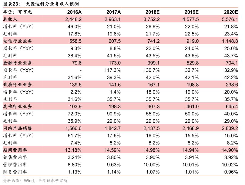 1)电信行业毛利率:根据公司2018年5月11日投资者关系活动记录表,在电信业务方面,公司正在进一步加强项目管控和体制改革,不断提升公司在电信行业的市场地位,业务模式也逐步由被动项目制转变为顶层设计自上而下的模式,这些都有助于提高公司议价能力。基于此,我们认为公司电信业务毛利率有望提升,预测18-20年电信业务毛利率分别为43.5%,43.6%,43.7%。