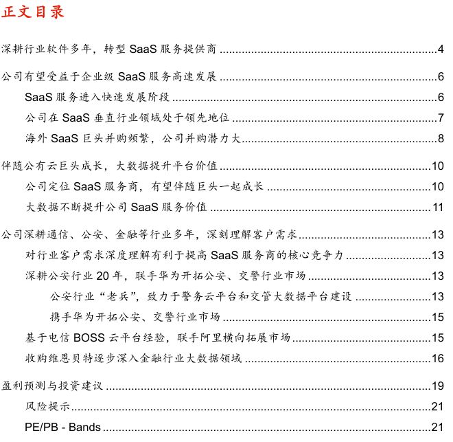 云基础设施的完善、企业管理模式的变革以及工业互联网+数字中国的政策激励,推动SaaS服务进入快速发展阶段。我国SaaS行业起步较晚,市场分散,但是发展势头强劲,公司专注于行业垂直型SaaS,在我国通信、公安、金融等垂直行业SaaS领域保持领先地位。我们认为,随着云计算的持续发展,公司有望通过并购扩展业务,凭借技术优势、行业优势、渠道优势、生态优势,从行业高速发展中受益。