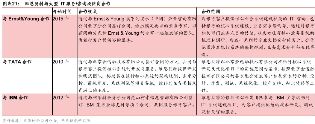 维恩贝特与Ernst&Young、TATA和IBM等世界级跨国公司合作。为了更好地拓展银行等金融类大型客户,提高服务优质客户的效率,维恩贝特积极与大型 IT服务/咨询提供商合作,与Ernst & Young于2015年开始建立合作关系,与TATA于2010年开始建立合作关系,与IBM于 2012年开始建立合作关系。
