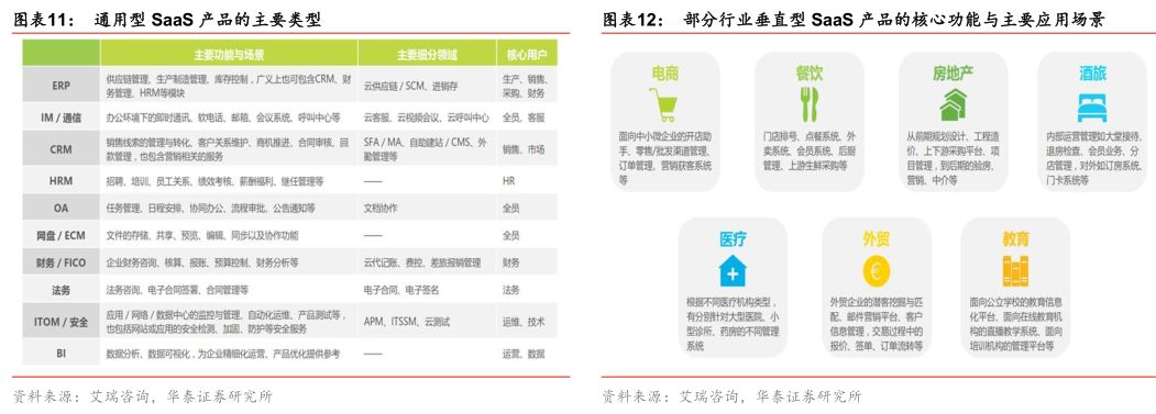 企业级SaaS服务可依据所服务客户的范围划分为两类。企业级SaaS的一类是通用型SaaS,也称为业务垂直型SaaS,是指不区分客户所在行业并为其提供通用服务的SaaS,包括CRM(客户关系管理)、HRM(人力资源管理)、协同OA、ERP(企业资源计划)等。另一类是行业垂直型SaaS,是指为特定行业提供SaaS服务,目前多为某一垂直领域中的传统软件商或行业解决方案服务商并行提供的SaaS服务。