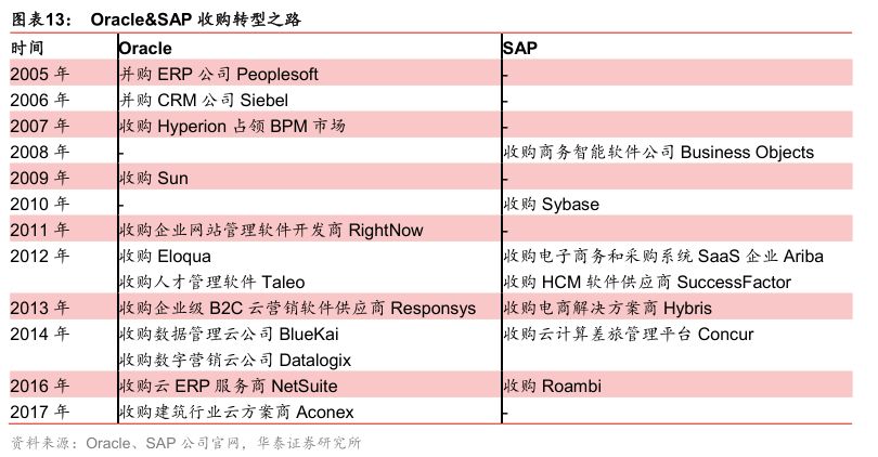 Oracle和SAP等传统软件巨头通过并购向SaaS服务商转型。Oracle和SAP通过收购其他优质SaaS企业来发展SaaS服务,比如Oracle通过并购开发CRM的公司Siebel占领CRM市场份额,SAP通过收购HCM企业SuccessFactor来加速公司人力资源领域的业务发展。通过并购,传统巨头的SaaS服务链逐渐完善,竞争力得到提升,逐渐完成向SaaS服务行业的转型。