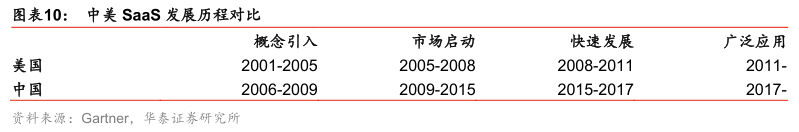 国内SaaS发展整体落后美国,但是发展迅速。我国SaaS服务起步较晚,在美国SaaS市场启动之后,我国才开始相关概念引入。而在市场启动阶段,虽然我国政府出台了一系列政策鼓励云计算的发展,吸引了跨国云服务商在我国部署云计算服务,但总体进程较慢,根据Gartner的研究,我国启动市场所用的时间约是美国的两倍,直到2017年我国才进入SaaS广泛应用的阶段,政府和大企业云化市场开始启动,企业开始广泛接受SaaS服务。尽管我国SaaS发展水平落后美国,但是我国SaaS市场发展势头强劲。根据中国产业信息网的预测,到2020年,中国SaaS市场占全球市场的比例将达到9.4%,成为全球SaaS市场重要组成部分。