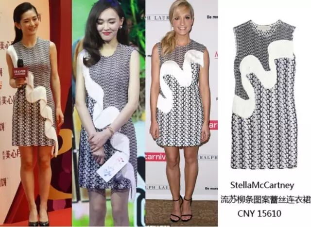 唐嫣身着Stella McCartney黑白流苏拼接礼服裙,胸前的白色拼接设计,貌似迎宾小姐~不过对比撞衫后,气质还好