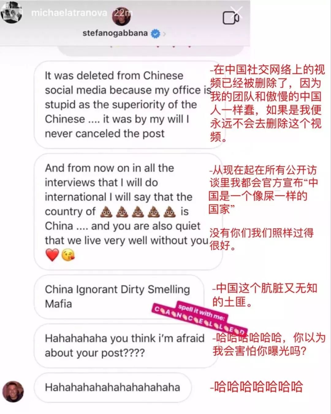 此次事件的爆发点是在“亚裔女模吃意餐”视频被质疑辱华后,就有外国网友去私信问了D&G的创始人+设计师之一Stefano Gabbana,孰料Stefano Gabbana不仅觉得这样的行为毫无问题,反倒脏字连篇,说出:“中国是一个像屎一样的国家”“没有你们我们照样过得好”。