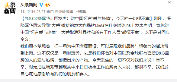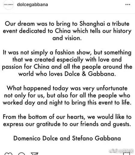昨天D&G辱华事件导致整个大秀被取消想必大家已经知道了,昨晚D&G再次发声明只提“不幸”,未见歉意,这将作死推向最高潮。