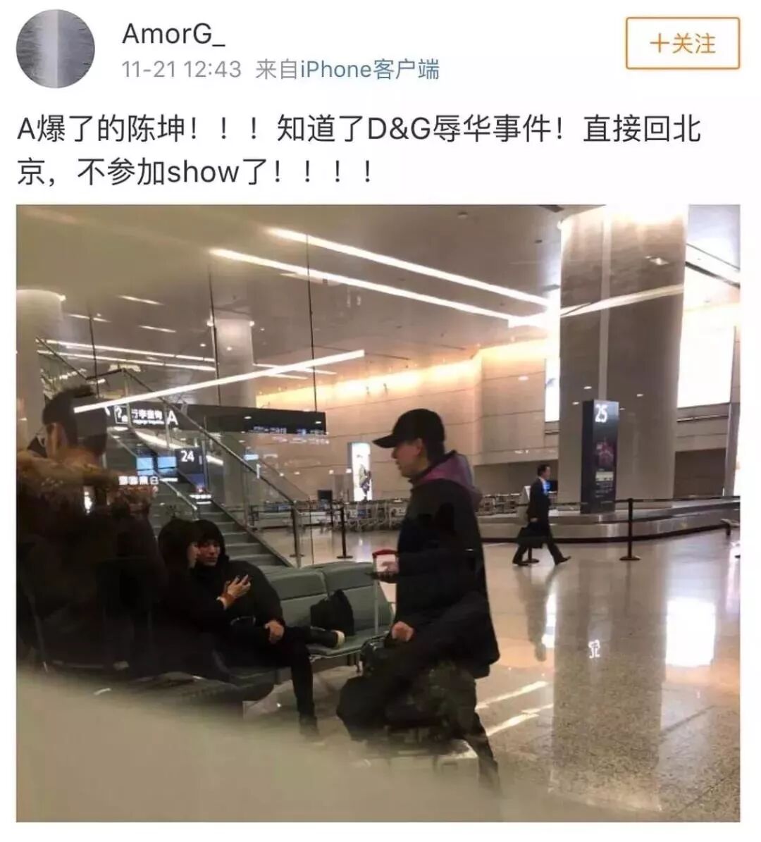 这个言论一曝光,原本要参加D&G活动的中国明星、模特们一下子都炸锅了,反应最快的是陈坤,据说他一下飞机看手机,看到出了这样的事,立马转头走了。