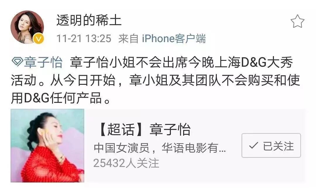 最刚的是章子怡,直接用表情包反击,更通过工作室表态:不仅不出席今晚的D&G大秀,从今以后也不会购买和使用他们家的任何产品。第一次看到明星在微博发脏话,感觉也是有点爽。