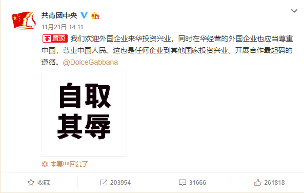 接下来的事情,就上升到了另一个阶段:共青团中央发表声明,大意是:如果你不尊重中国和中国人民,那为何还有胆子来中国捞钱?