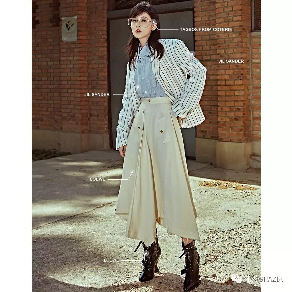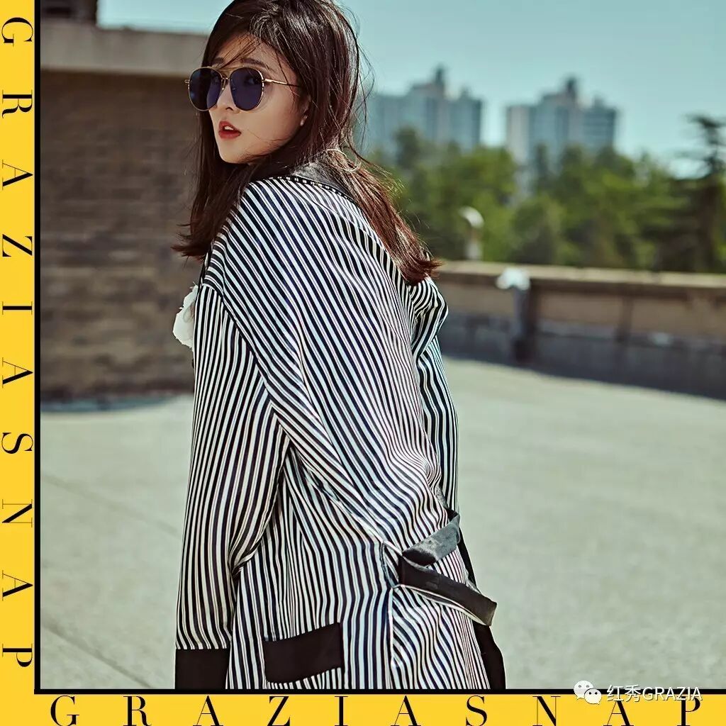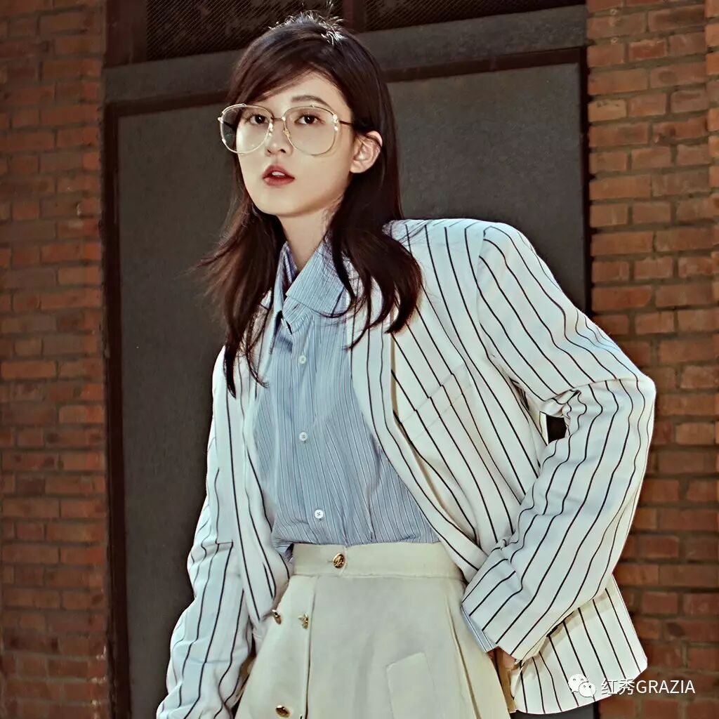 你以为我们乔妹只能打乖乖牌的关雎尔吗?穿上廓形条纹西装、搭配条纹衬衫和尖头粗跟靴的乔欣毫无违和感,游刃有余上演廓形硬朗的高级时装STYLE,金框眼镜更平添犀利感。