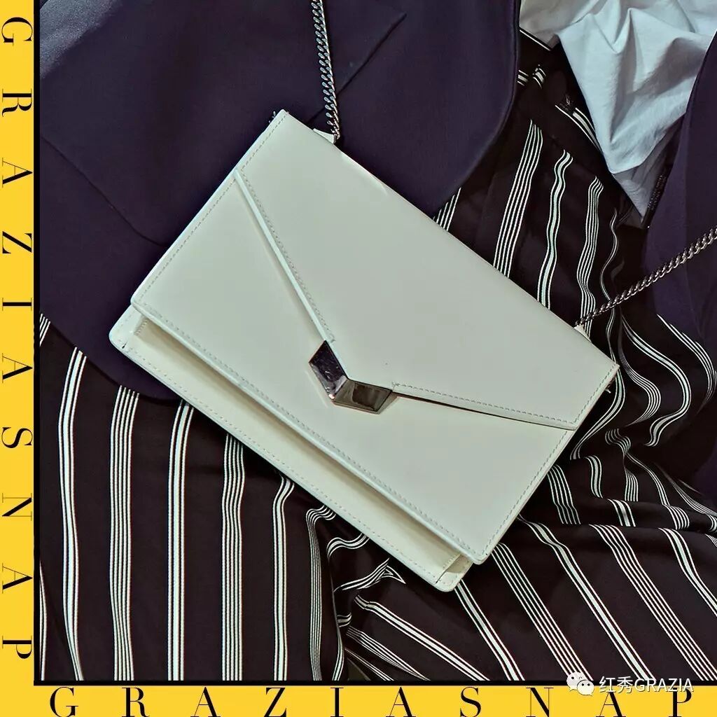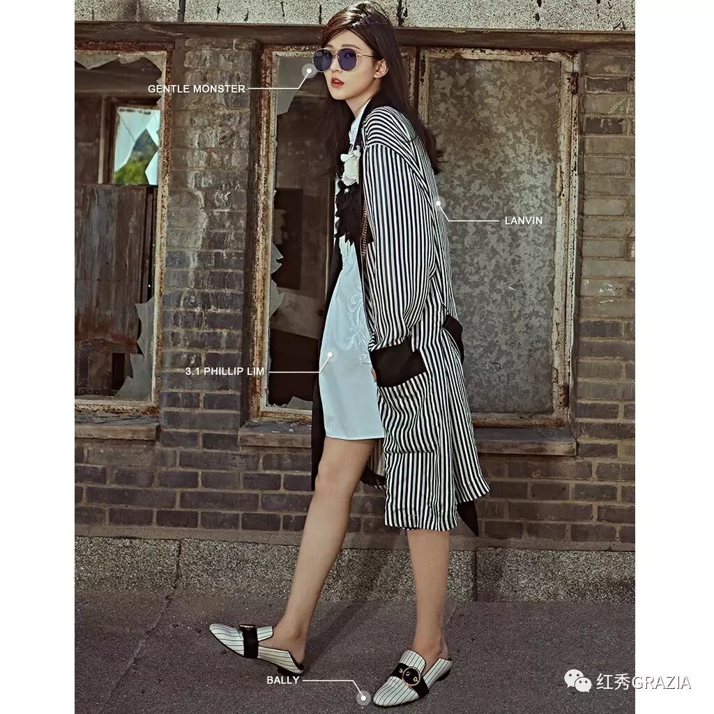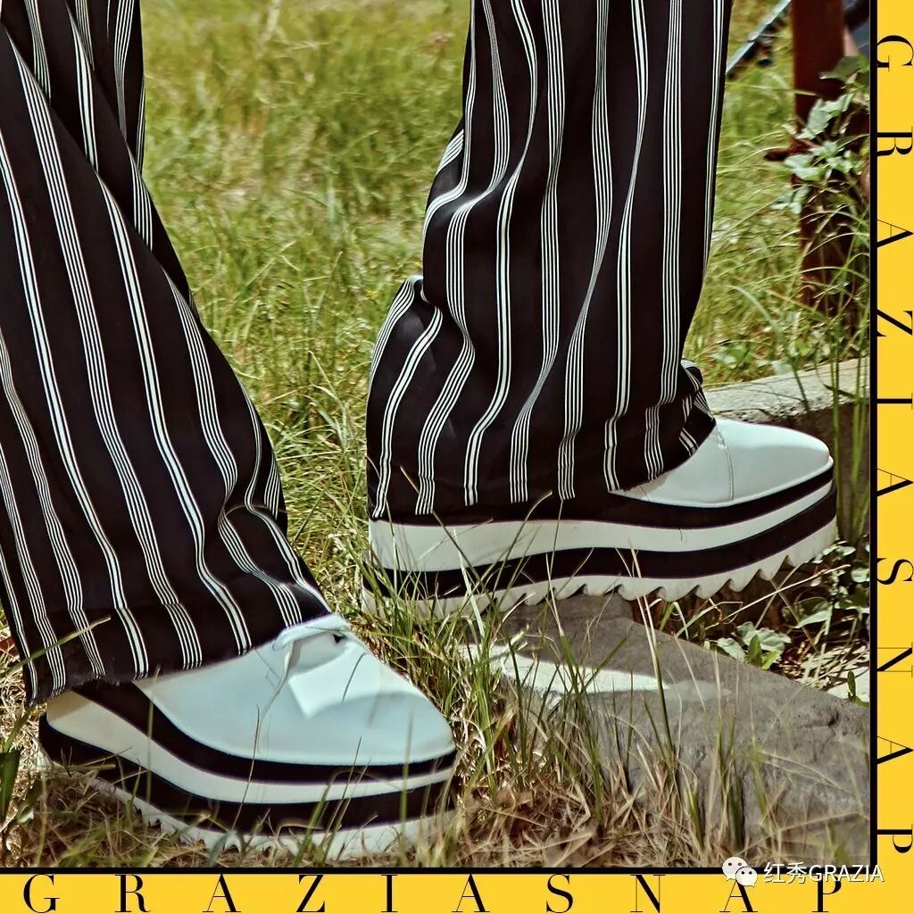 你以为我们乔妹只能打乖乖牌的关雎尔吗?穿上廓形条纹西装、搭配条纹衬衫和尖头粗跟靴的乔欣毫无违和感,游刃有余上演廓形硬朗的高级时装STYLE,金框眼镜更平添犀利感。