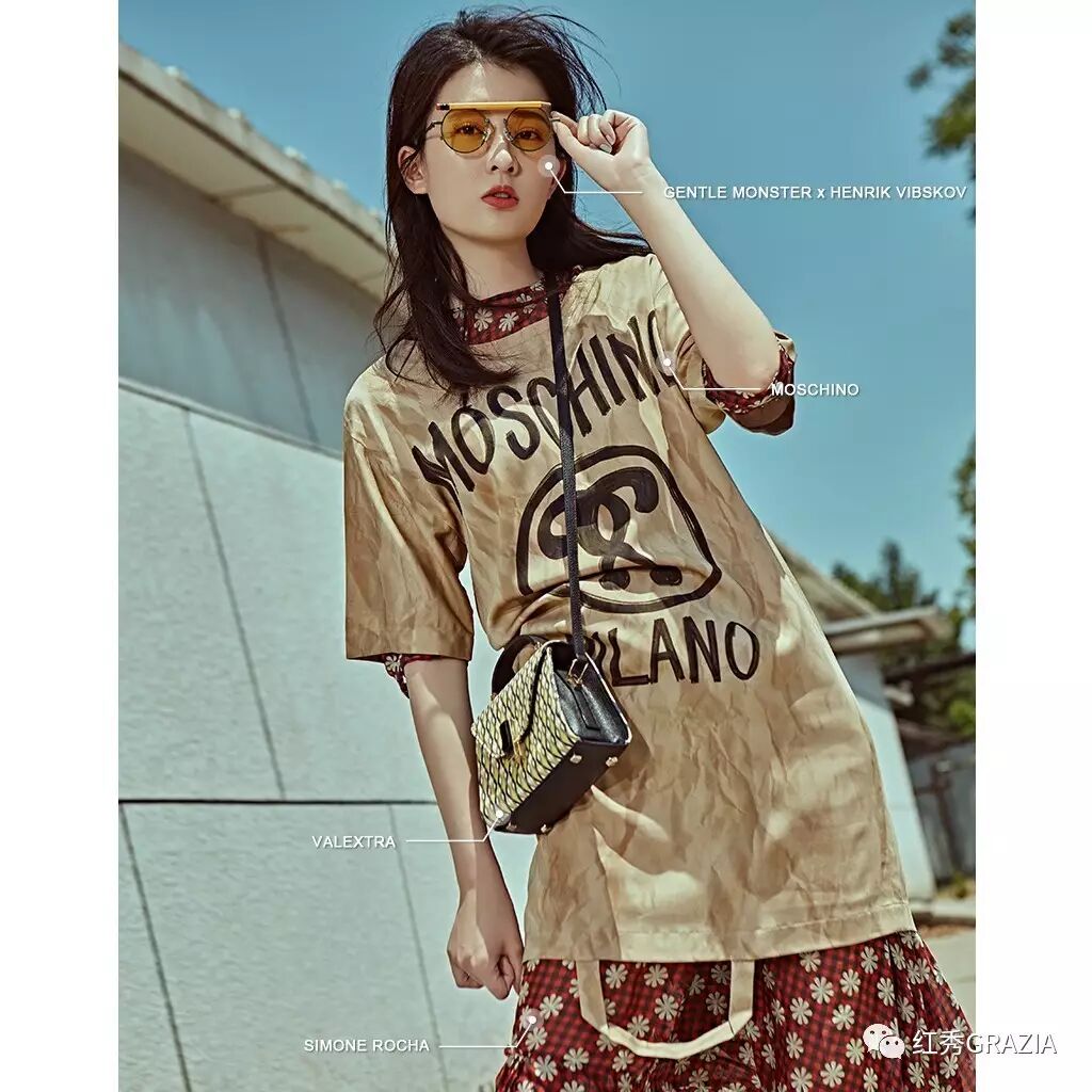 维多利亚式浪漫复古印花长裙结合街头感气息的OVERSIZE长TEE,将古典与潮流巧妙融为一体,便是我们乔妹的又一张王牌:清新有有点小浪漫感。而点睛之笔便是谐趣鬼马的圆框太阳镜,这样灵动却不失时装感的乔欣有没有让你耳目一新。
